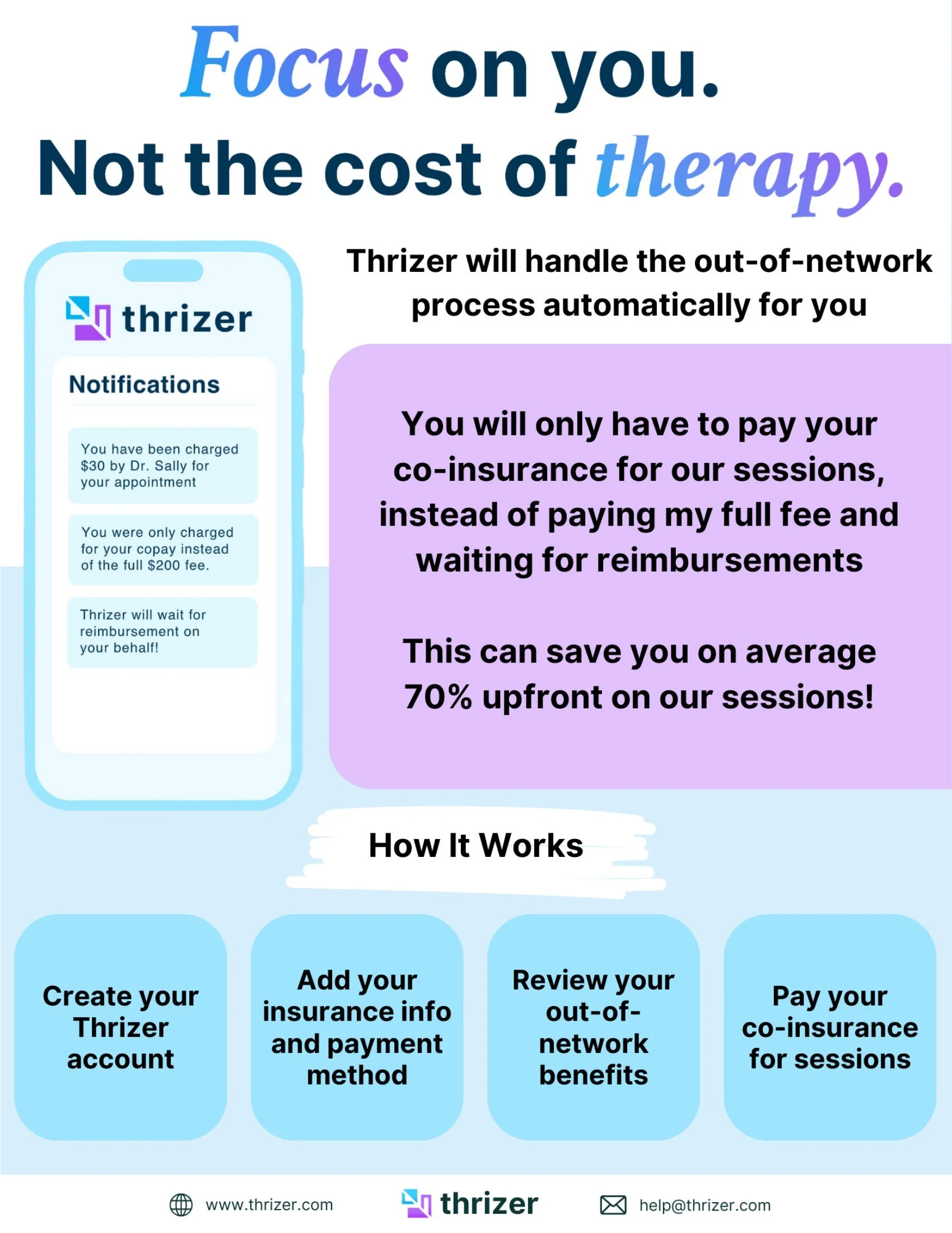I currently accept these insurances: Blue Cross Blue Shield PPO. For all other insurances, you may have out-of-network benefits, which means that insurance will reimburse you for a portion of our session cost. I have partnered with Thrizer to handle the out-of-network process automatically for you. With Thrizer, you will only have to pay a copay for our sessions post-deductible, instead of paying my full fee and waiting for reimbursements. This typically allows clients to save on average 70% upfront on our sessions. During our intake process, I can help you verify if you have out-of-network benefits and how much your co-insurance would be.